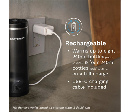 - Rechargeable: Advanced battery technology warms up to eight 180 ml bottles (from room temp to 37°C) & up to four 180 ml bottles (from cold to 37°C) on a full charge; Includes USB-A charging cable; Power adapter not included (for fastest charging, use 20W charging block)