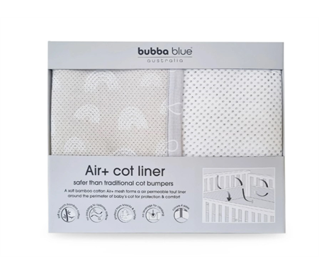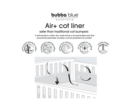 The Bubba Blue Air+ Cot Liner is the first and the best of its kind. Its slimline design uses an air permeable 3D spacer mesh & a bamboo cotton mesh to form a taut protective liner around the inside perimeter of the cot.