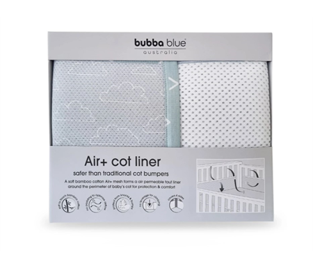 The Bubba Blue Air+ Cot Liner is the first and the best of its kind. Its slimline design uses an air permeable 3D spacer mesh & a bamboo cotton mesh to form a taut protective liner around the inside perimeter of the cot.