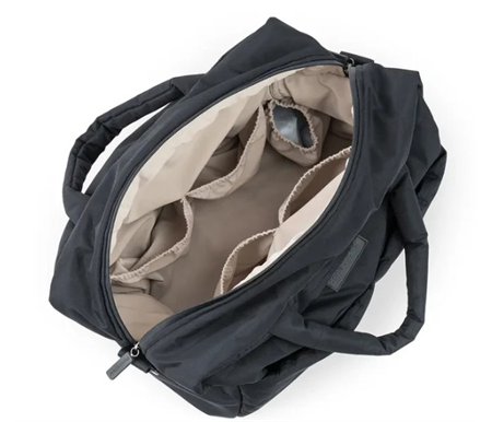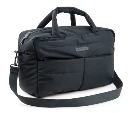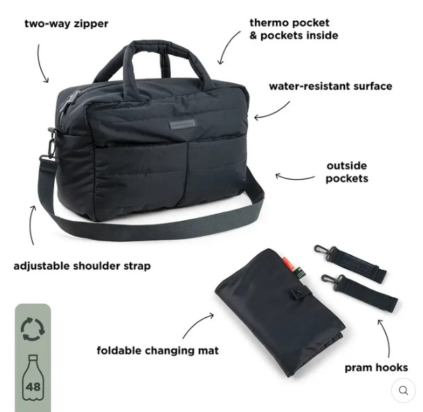 The bag has an insulated pocket inside to keep fluids hot or cold. The water-resistant surface protects your essentials from getting wet. The bag and changing mat are made of recycled polyester made from 48 used PET bottles.