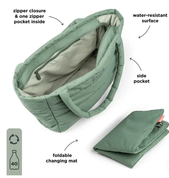This cool green quilted tote bag is perfect for all of the extra essentials you and your little one need on the go. With a secure zipper closure, your belongings stay safe and sound, while the durable, water-resistant surface ensures it stands up to daily adventures.