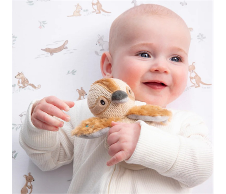 Delight and soothe your little one with our charming Kookaburra Rattle. Crafted from soft cotton knit with a handmade feel, it features a gentle jingle and a BPA-free silicone teether ring - perfect for tiny hands and growing gums.