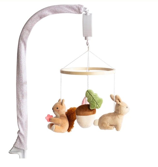 Little ones will love watching the adorable bunny hop toward its mushroom house and the playful squirrel chase its acorn, gently rotating overhead to the soothing tune of Brahms’ Lullaby. With exquisite detailing, this charming musical cot mobile adds the perfect finishing touch to your nursery, helping your baby drift off to sleep in a dreamy whimsical world.