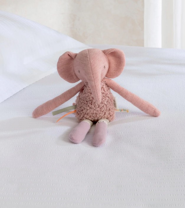 Our delightful miniature Edie Elephant activity toy is the perfect companion for both playtime and snuggles on the go. With a mix of textures, colours, and sounds to explore, she’ll captivate baby’s senses while her super-soft fabrics and squishy, bean-filled body provide soothing comfort.