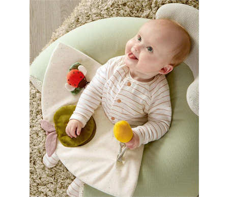 Detachable panel full of interactive toys – including cute, cuddly ladybird - to spark their imagination, stimulate their senses and hone their motor skills. Made from super soft, tactile fabrics featuring striking patterns to captivate little hands and eyes.