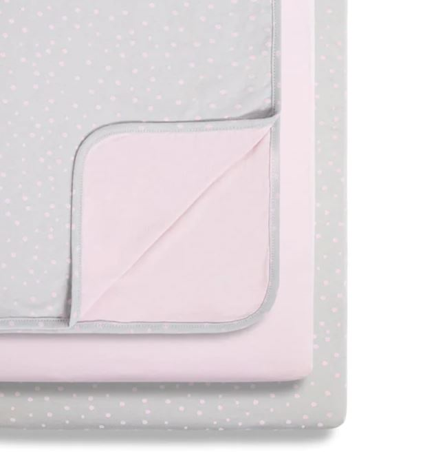 Includes two fitted sheets and a reversible blanket made from 100% jersey cotton. Fits bassinet mattresses 35cm X 80cm to 45cm x 90cm.