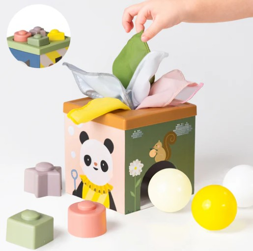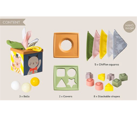 This 4 in 1 activity cube features x5 vibrant chiffon tissues, 3 play balls and 8 stackable shapes. The play and discover cube promote cognitive growth and motor skill development through interactive play.