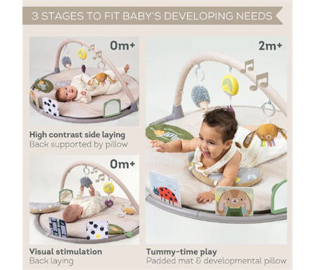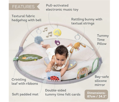 - Enhance baby’s tummy time experience with our plush padded mat paired with a tummy time pillow & a unique floor arch that provides a platform for arranging toys during side laying and tummy-time exercises.