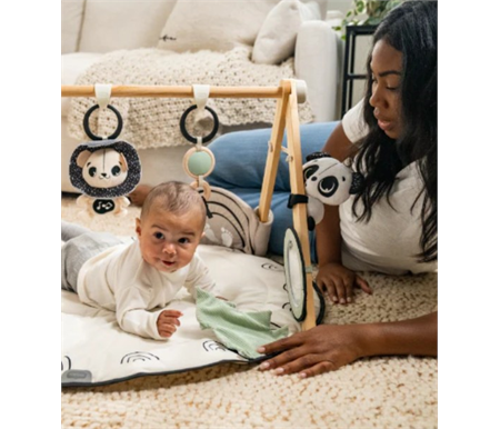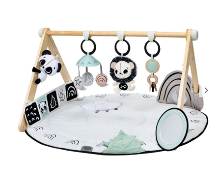 - Double-padded, extra-soft mat with stand-alone wooden toy arch