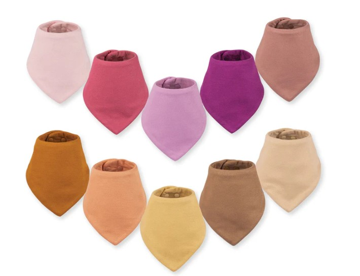 This set features ten soft, absorbent and water repellent, bandana-style drool bibs. Soak up drool without soaking through! Our luxurious, silky-soft, breathable Kaffle® weave fabric is combined with a waterproof inner layer to provide lightweight comfort and fashionable clothing protection. Easy to use snaps closure allows for an adjustable fit.