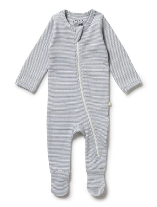 Wilson & Frenchy - Organic Stripe Rib Zipsuit with Feet - Rain Drop - Organic Stripe Rib - 3 to 6 months